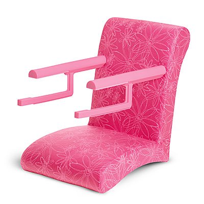 American Girl pink doll chair used in the American Girl Bistro/Cafes for seating of the American Doll at the dining table. This size accommodates the Bitty Baby and Bitty Twins, as well. Slides on table. American Girl does not sell this product in an American Girl box. Therefore, it will ship inside a regular shipping box when item is purchased.