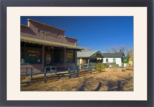 30 x20 Framed Print, Black Satin Frame Off-White Digital Mat. showing Diner used in Wild Hogs movie, Madrid, Turquoise Trail, New Mexico, United. Diner used in Wild Hogs movie, Madrid, Turquoise Trail, New Mexico, United States of America, North America. Chosen by Robert Harding. 30 x20 wooden frame with digital mat and RA4 print. Finished back including brown backing paper, hanging bracket and corner bumpers. This item is shipped from our